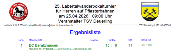 Heuer startete das 25. Labertal-Wanderpokal Turnier auf den Stockbahnen des TSV Deuerling. Zu diesem 25. Labertal-Wanderpokal Turnier wurde auch ein neuer Wanderpokal fällig, da im Vorjahr der Wanderpokal der vergangenen Jahre in den Besitz des ASV Undorf übergegangen ist. Der neu Wanderpokal wurde wie der Vorgänger von der Gemeinde für diesen alljährigen Wettbewerb gestiftet. Beim Wettbewerb war es spannend bis zum letzten Durchgang, vier Mannschaften hatten bis zum Schluss noch die Möglichkeit auf den Wanderpokal. Am Ende des Wettbewerbs sicherte sich der EC Beratzhausen den Sieg vor ASV Undorf und dem TSV Brunn. Bei der Siegerehrung im Anschluss dankten Abteilungsleiter und Bürgermeister für den fairen Wettbewerb und überreichten die Preis unter anderen den neu gestifteten Wanderpokal der Gemeinde Deuerling. Ergebnisse vom Turnier können unter Stockabteilung abgerufen werden