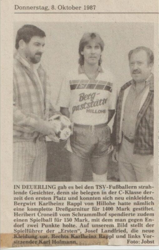 Im Jahr 1987 erhielt der TSV neue Trikots von der ehemaligen Berggaststätte Hilohe, geführt von Heinz und Renate.